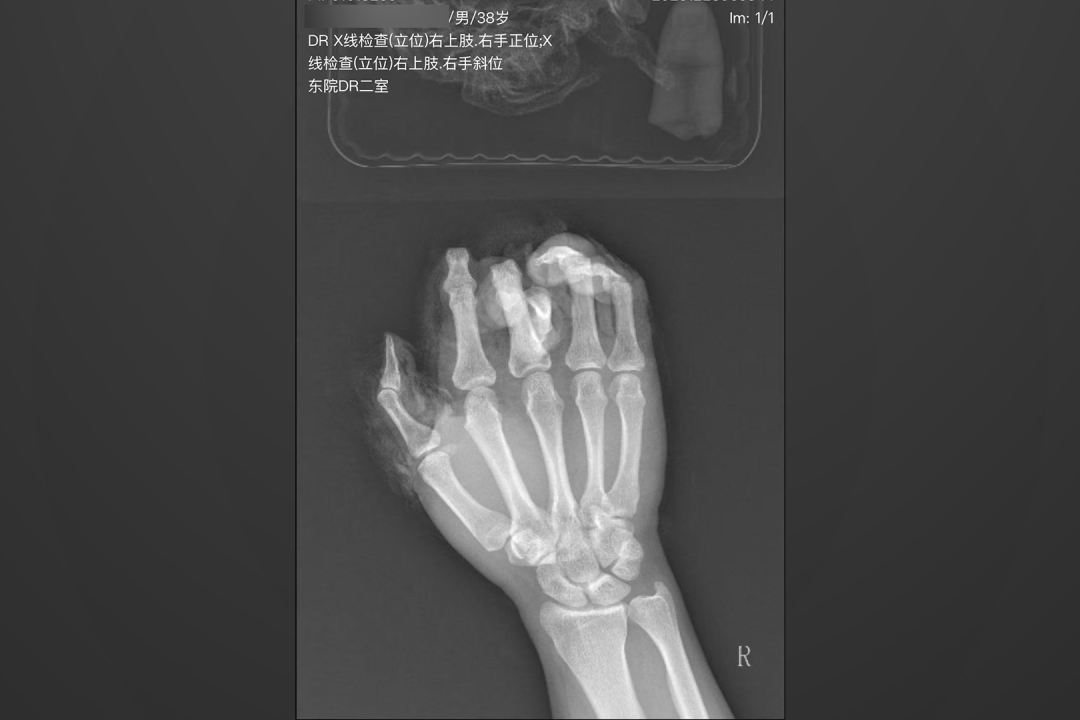 当天早上,吴先生(化名)的右手不慎被机器绞伤,被紧急送到烟台山医院。检查发现,其右手拇指、食指、中指完全离断,且损伤类型极为特殊——并非整齐切断,而是皮肤、软组织像“脱手套”一样,从近端向远端呈现“手套状”撕脱,骨骼、肌腱、血管及神经被暴力抽出,损伤范围巨大,污染严重。