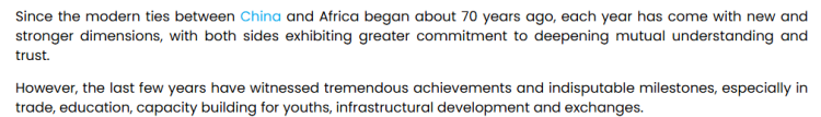 布里奇特·奇杜·奥诺奇在文章中说,70年来,中非关系日新月异,双方都秉持坚定的决心,持续加深相互了解与信任。同时,双方在贸易、教育、青年能力建设、基础设施建设等广泛领域取得了实实在在的、里程碑式的成就。