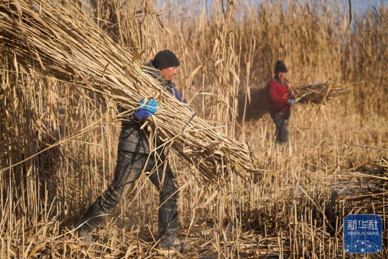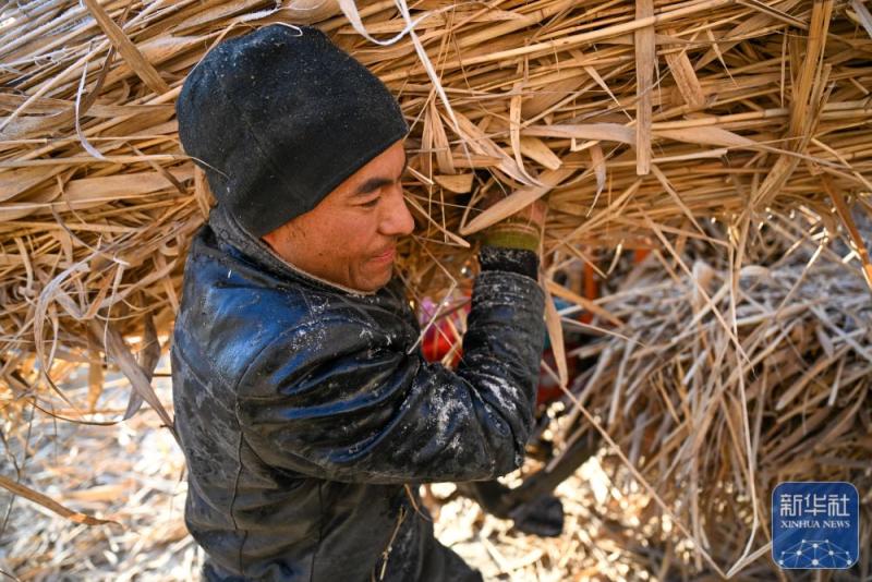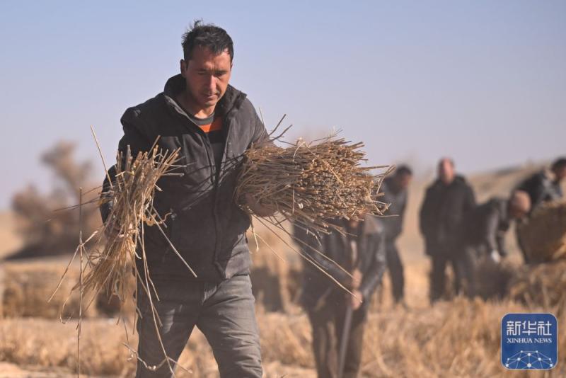 ↑ 在新疆和田地区墨玉县扎瓦镇,当地农民在收割芦苇(1月10日摄)。