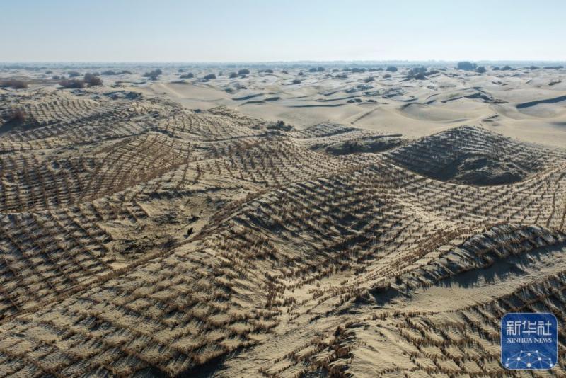 ↑ 这是在新疆和田地区墨玉县喀瓦克乡周边沙漠拍摄的草方格(1月11日摄,无人机照片)。