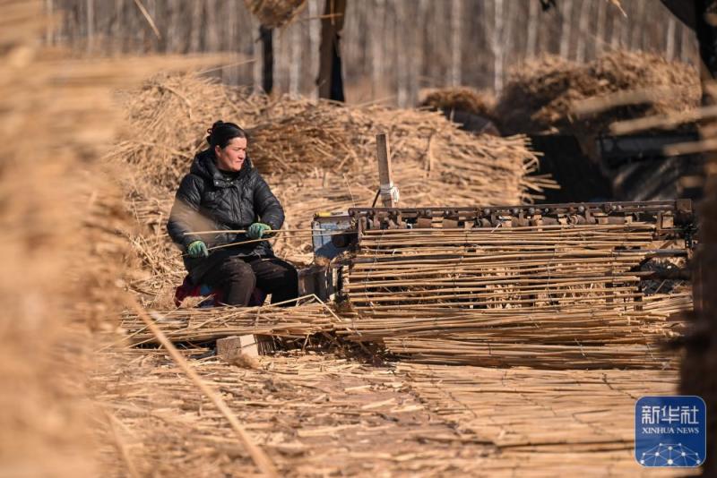 ↑ 在新疆和田地区墨玉县碧玉农产品农民专业合作社,农户将收割的芦苇压制成捆(1月10日摄)。