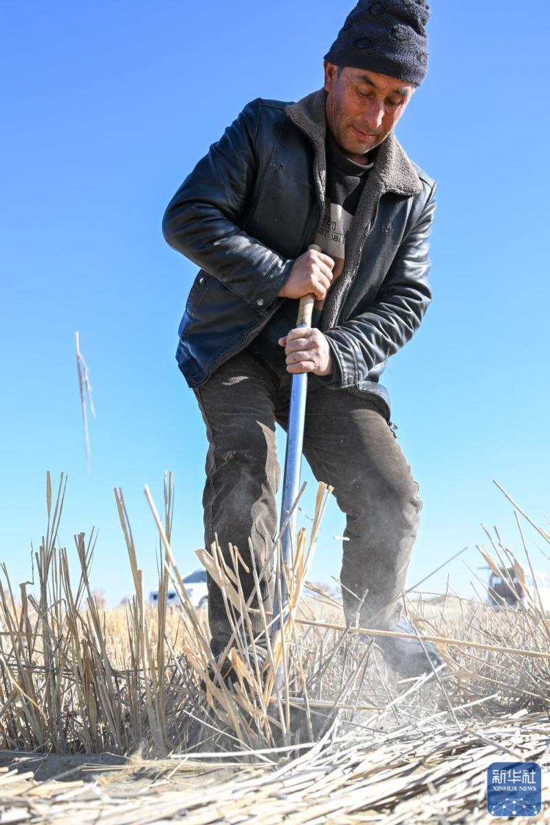 寒冬时节,尽管塔克拉玛干沙漠南缘的新疆和田地区墨玉县气温跌破零摄氏度,这里却涌动着治沙攻坚的热潮。数十台推土机轰鸣作业,推筑阻沙堤、平整沙丘,本地农户忙着收割加工芦苇、铺设草方格,冬季治沙工程高效推进。