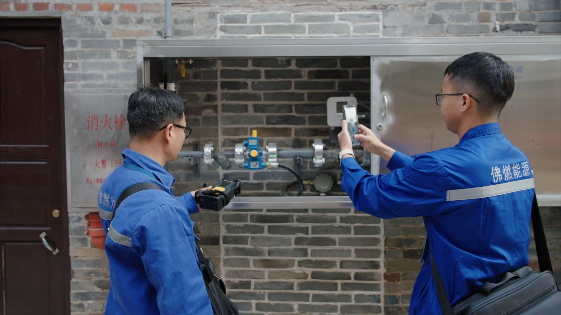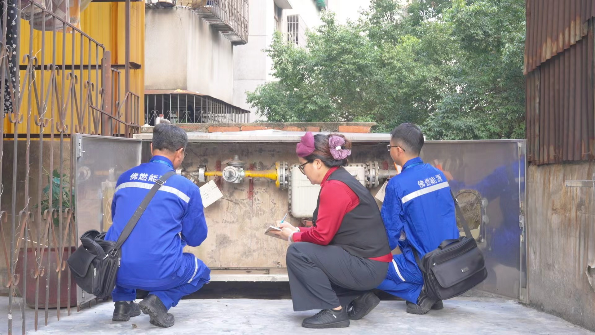 张姐与禅城能源工作人员检查管道