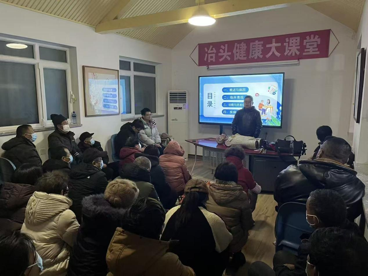当晚18时整,冶头村村委会的灯光准时亮起,50多位村民早已在此翘首以待,期盼着专家的到来。活动伊始,血管外科党员医生王涛用亲切的乡音向村民们解释了情况:“风雪无情人有情,虽然大风大雪把王新主任‘堵’在了长岛,却阻挡不了我们送健康的决心!今晚由郇振东医生为大家授课,欢迎郇医生!”话音刚落,现场便响起了热烈的掌声。
