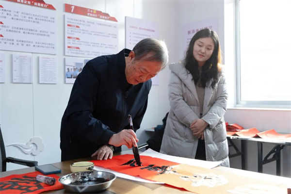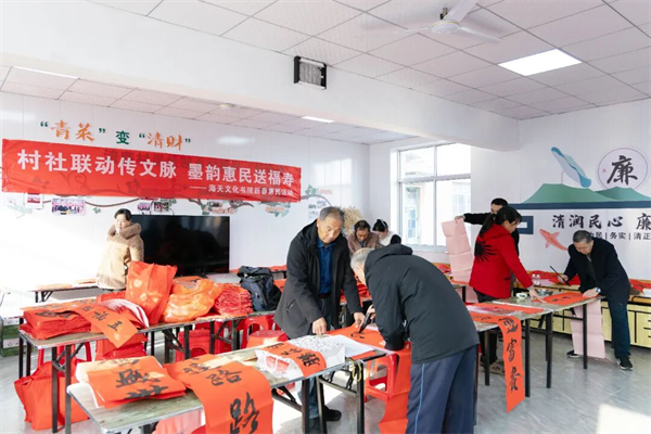 胶东在线1月20日讯(通讯员 郭健 实习编辑 单煜媛)新春将至,气温骤降,寒意袭人的烟台高新区马山街道新添堡村委里却暖意融融、热闹非凡。1月16日,烟台高新区海天文化书院走进马山街道新添堡村开展“迎新春 写春联 送福寿”文化惠民活动,用墨香与关怀驱散了冬日寒凉。五位书法名家现场挥毫泼墨,为村民送上600余幅定制春联及60余幅“寿”字佳作,将浓郁的传统年俗与真挚的文化温情,精准送达百姓家门口,更暖进了村民心坎里。