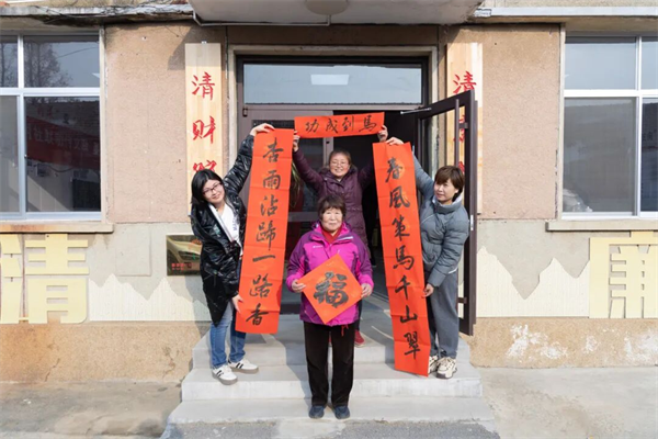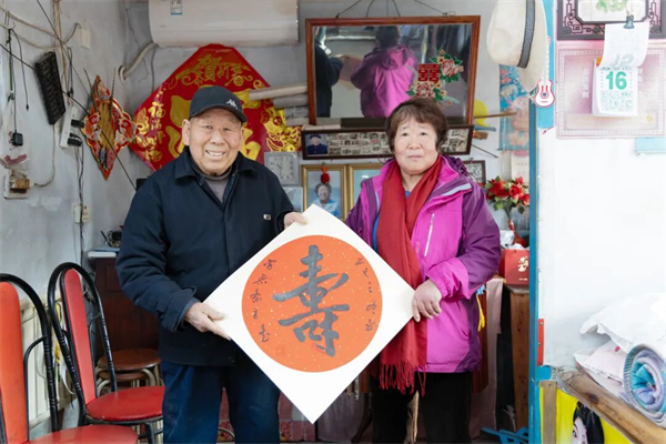 除了现场送春联,活动更将敬老温情延伸至高龄老人家中。新添堡村两委干部组成爱心小分队,带着饱含敬意的“寿”字作品,逐一走访慰问高龄老人,详细询问老人们的日常生活与身体健康状况,叮嘱他们注意保暖、安度新春。不少老人接过红彤彤的“寿”字时,眼眶湿润:“谢谢你们还惦记着我们这些老人,这‘寿’字比啥礼物都珍贵!”简单的话语里,满满的感动与温暖。