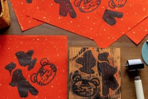 简化木版年画制作流程,提前制作好简易的木版年画模板,提供红色、金色等喜庆颜色的颜料(水性颜料,易清洗)、宣纸,讲师讲解烟台木版年画的历史和寓意,指导儿童用滚筒蘸取颜料在模板上均匀涂抹,再覆盖宣纸按压,完成拓印,制成“新年年画”,可用于新年贴在家中或赠送亲友。