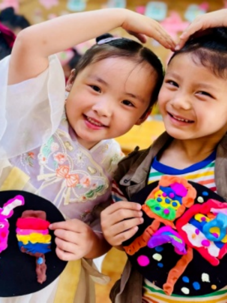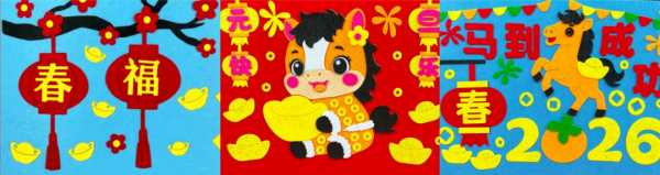 提供提前裁剪好的各色棉布(柔软亲肤,边缘处理光滑)、硬纸板(印有春节相关自然萌宠轮廓,如兔子、梅花鹿)、儿童专用固体胶、装饰辅料(小纽扣、彩线)。先讲解胶东布贴画的历史与拼贴技巧,再指导儿童根据轮廓选择对应颜色的布料,裁剪后粘贴在硬纸板上,用辅料装饰细节,制成 “新春布贴萌宠画”,最后装入简易画框,可作为家庭装饰或新年礼物。
