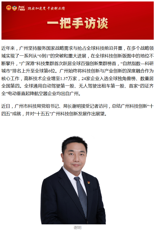 广州市科技局党组书记、局长谢明接受南方日报、南方都市报、广州日报等媒体访问时表示,面向“十五五”,将以建设具有全球影响力的科技创新强市为总目标,系统构建“大科创体系、产业培育体系、成果转化体系、创新生态体系”。