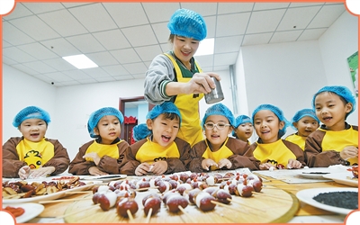 山东省乐陵市天和嘉园幼儿园,小朋友在老师帮助下体验面食制作。 刘振兴摄(新华社发) |