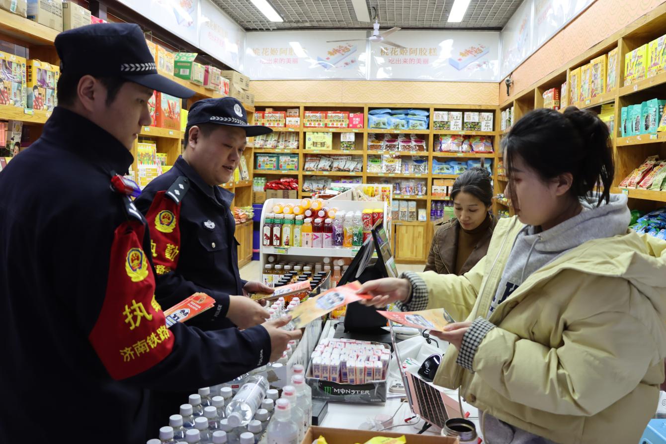 民警在客流密集区域现场普法宣传,并利用“济南铁警”公众号、车站LED屏等载体,广泛宣传安全知识和便民举措,积极营造平安春运的浓厚氛围。