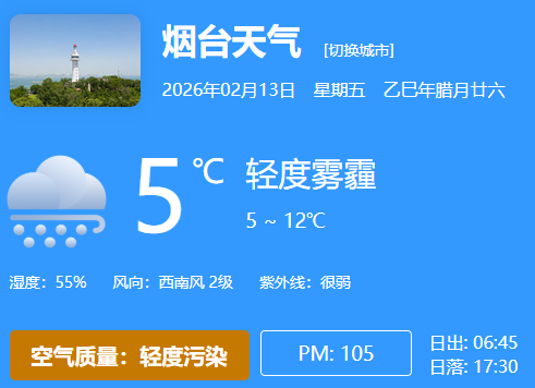 常规预报: 烟台市海洋环境监测预报中心发布24小时海洋预报(2月13日0时-2月14日0时) 东部海域(开发区至牟平区)将有0.4米的小浪,风浪向西南;平均水温:1.4-2.3℃; 蓬长海域(蓬莱区)将有0.4米的小浪到0.6米的轻浪,风浪向西南;平均水温:1.3-4.8℃; 西部海域(莱州市至龙口市)将有0.4米的小浪,风浪向西南;平均水温:0.7-2.1℃; 南部海域(海阳市至莱阳市)将有0.6米的轻浪,风浪向西南;平均水温:2.4℃;