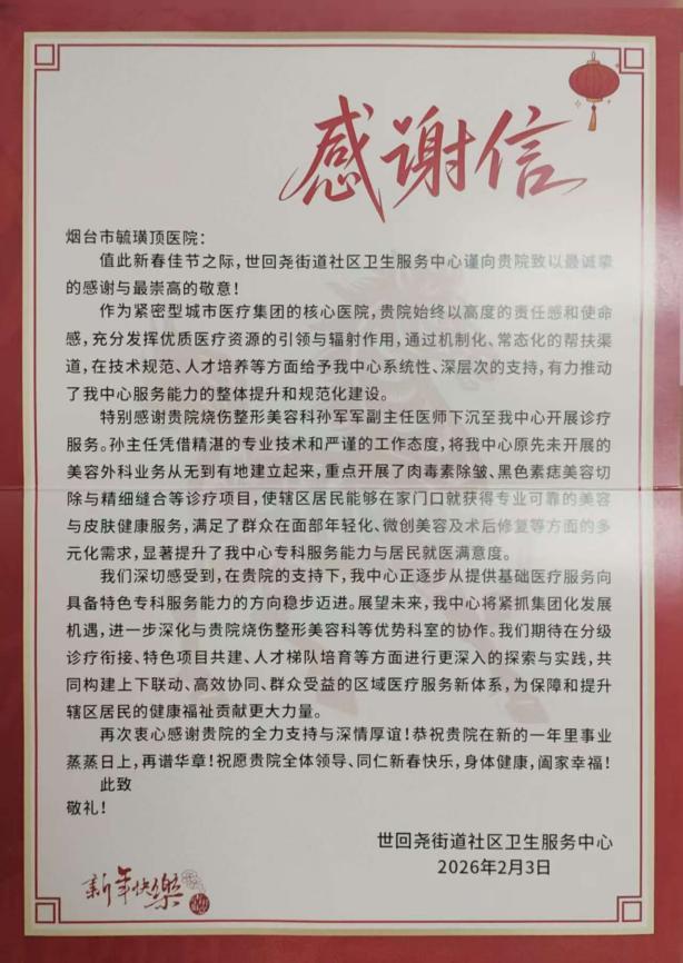 胶东在线2月14日讯(通讯员 李成修 侯瑞)近日,烟台毓璜顶医院收到烟台市芝罘区世回尧街道社区卫生服务中心的感谢信。信中,该中心对医院长期以来的帮扶与专业指导表示感谢,并表示在医院全方位支持下,正逐步从基础医疗向特色专科服务转型升级。信中还特别肯定了医院烧伤整形美容科副主任医师孙军军。作为“万名医护进乡村”派驻帮扶医生,他助力该中心从零搭建起美容外科业务体系,让辖区居民在家门口就能享受到三甲医院标准的专业美容与皮肤健康服务。