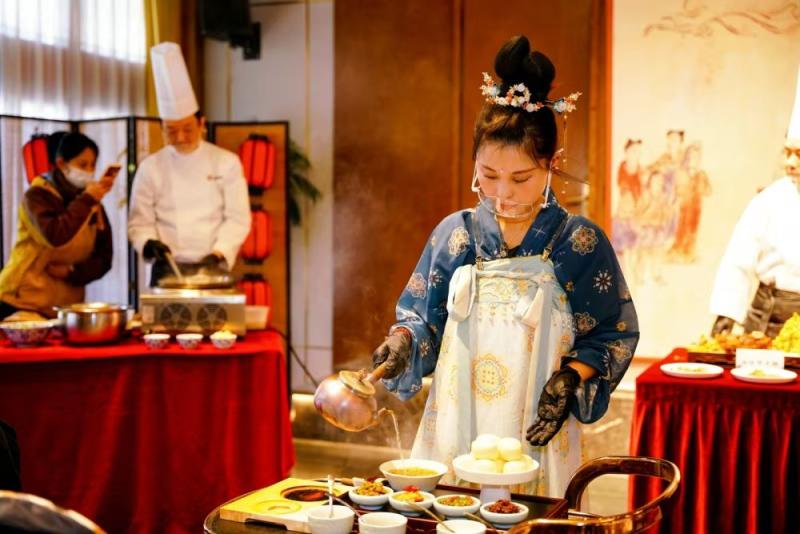 距北京1000多公里,位于陕西省西安市东大街的西安饭庄后厨飘香,厨师们正为招牌菜葫芦鸡“塑形”。一旁,集科普展览、研学工坊与沉浸餐饮于一体的陕菜文化体验博物馆,迎来了当日首批预约参观的小学生。