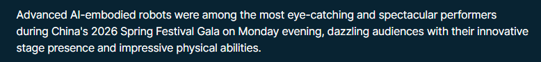 欧洲《现代外交》网站17日刊文指出,中国通过春晚展示了人形机器人技术,是国家技术进步和产业战略的象征。文章称,今年春晚的节目重点突出了中国在人形机器人技术、人工智能和下一代制造业领域发展的雄心。有四家机器人公司展示了能够完成武术动作、同步舞蹈以及与演员进行互动表演的人形机器人。