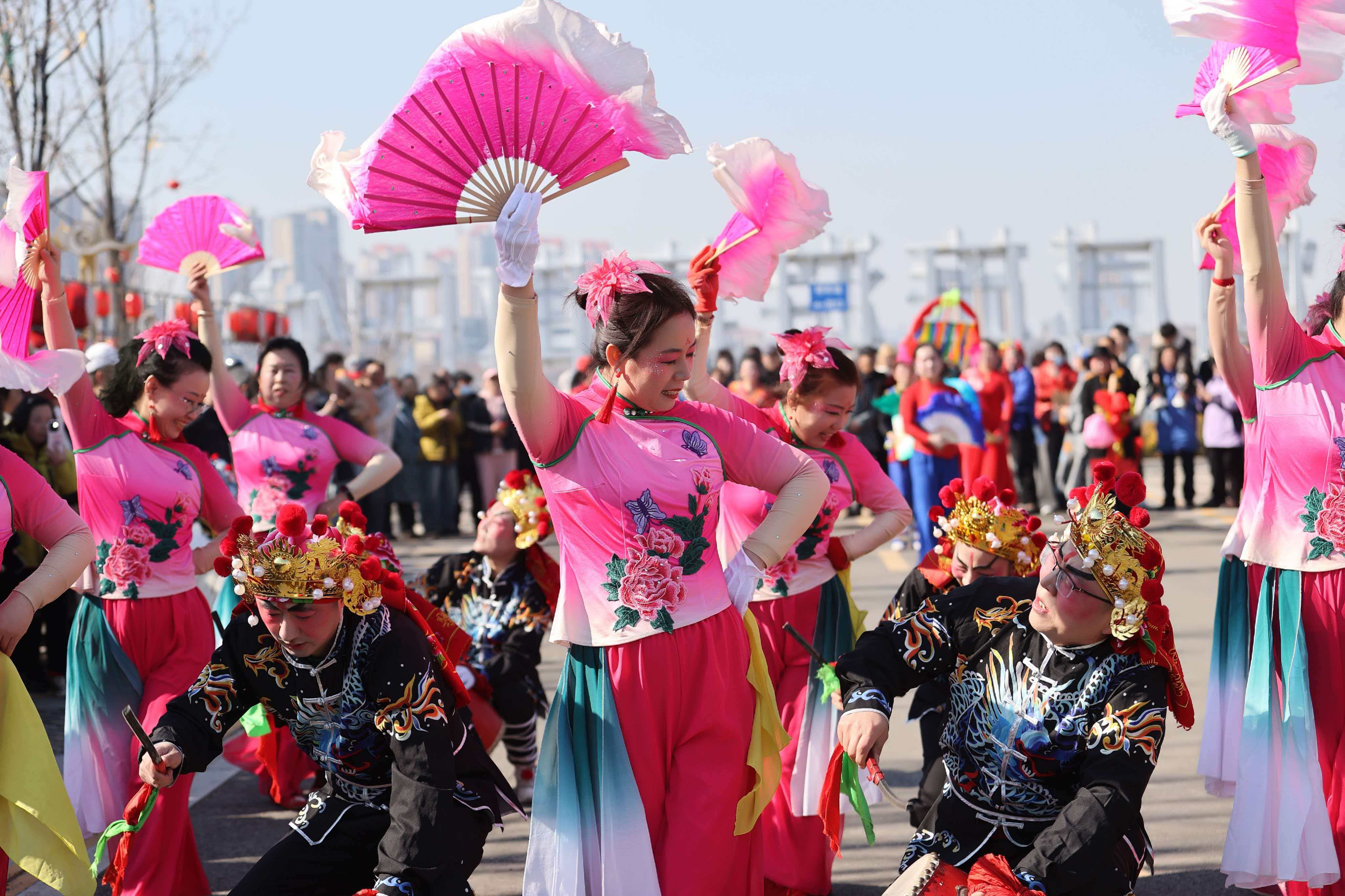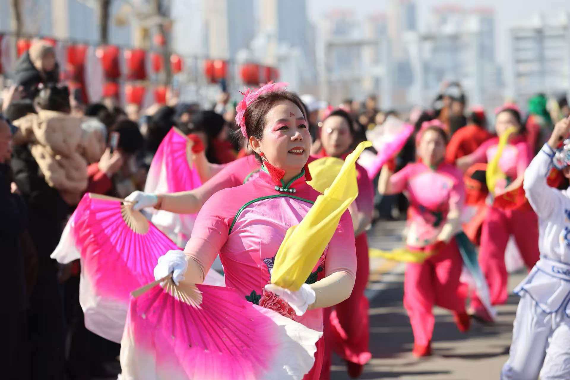 本届庙会亮点众多,但若论最能代表胶东年味的“灵魂节目”,海阳大秧歌当之无愧。当高亢的唢呐声划破长空,密集的锣鼓点如暴雨般落下,原本分散在各个摊位前的游客便自动向表演区聚拢。这不仅是表演,更像是一场全员的集结号。秧歌队一出场,气氛瞬间被点燃。乐大夫执伞舞动,指挥全局;花鼓、彩扇、货郎、翠花……各色人物轮番登场。 演员们动作夸张奔放,时而腾跃,时而旋转,眉眼间全是戏。最绝的是“逗”与“扭”——货郎挑担与翠花眉目传情,王大娘与箍匠人插科打诨,诙谐幽默的互动惹得围观的大爷大妈们前仰后合,孩子们则学着扭动身子,跟在队伍后面有样学样。