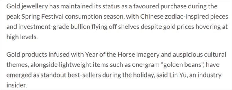 报道还称,黄金珠宝在春节消费旺季持续保持热门购买地位,尽管金价处于高位,但生肖主题设计的黄金饰品和投资级金条依然畅销。报道援引业内人士的话称,融入马年元素和吉祥文化主题的黄金产品,以及如一克“金豆”等质量较轻的产品,在节日期间成为最畅销的品类。