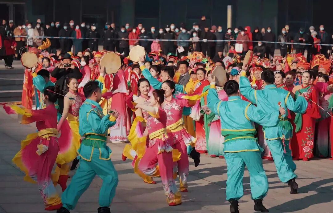 曹州传统秧歌是流行于山东菏泽地区的民间舞蹈,是省级非物质文化遗产,也是菏泽地域文化的重要代表之一。它以热烈奔放的动作、夸张诙谐的表演风格,以及鲜明的地方特色,深受群众喜爱。秧歌表演中,“大姑娘”“丑小二” 等经典角色各具特色,动作刚劲有力又不失灵动,既有集体阵式的磅礴气势,也有单人、双人表演的细腻传神。其内核源于 “担经” 等传统民俗,承载着祈福纳祥、叙事传情的文化功能,在春节、元宵、庙会等重要节庆中,是营造普天同庆氛围的核心载体。如今,以菏泽市曹州古韵秧歌队为代表的民间团体,正致力于传承与创新。这支成立于2017年的队伍,由退休文艺爱好者组成,他们扎根曹州文化土壤,在演绎经典套路的同时融入地方古韵,让传统秧歌在当代舞台上焕发新生,成为菏泽地区一道亮丽的文化风景线。