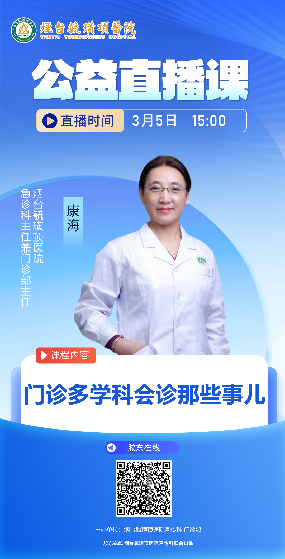 胶东在线2月26日讯(记者 栾雪 通讯员 李成修 王婧)看病辗转多个科室、检查重复做、方案难统一,是不少复杂疾病患者的就医痛点。为帮大家清晰了解门诊多学科会诊(MDT)这项诊疗服务,烟台毓璜顶医院门诊健康讲堂系列之二 ——“门诊多学科会诊那些事儿”即将开讲!医院门诊部主任倾情开讲,带您全面解锁门诊多学科会诊(MDT)的独特优势,让优质医疗更可及,让贴心服务更暖心。