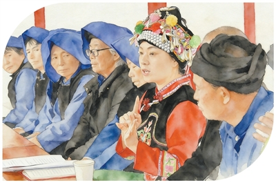 全国人大代表、云南省大理白族自治州南涧彝族自治县碧溪乡凤仙村村民鲁丽华(右三)在南涧彝族自治县无量山镇新政村宣讲全国两会精神。 适志宏摄(新华社发) |