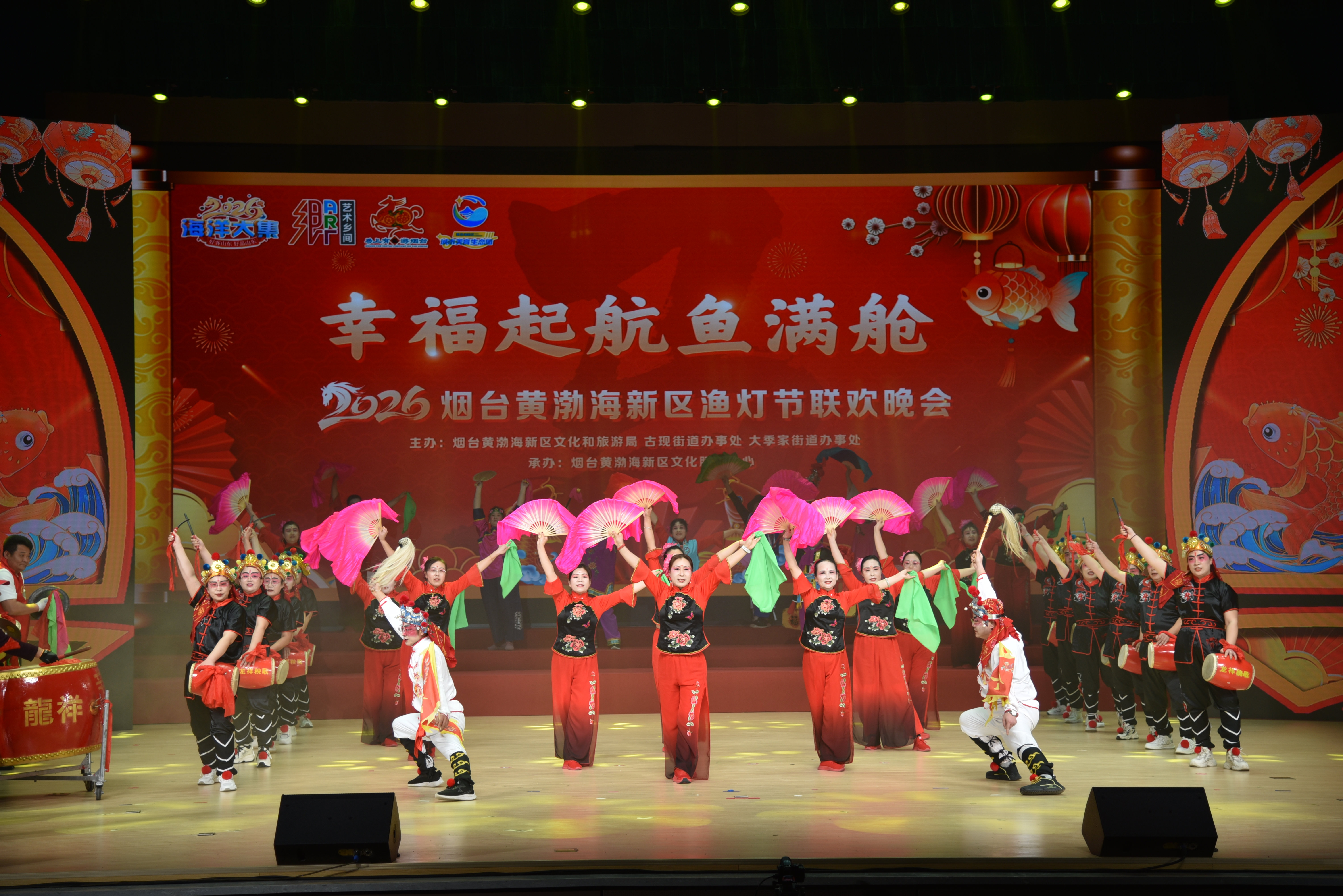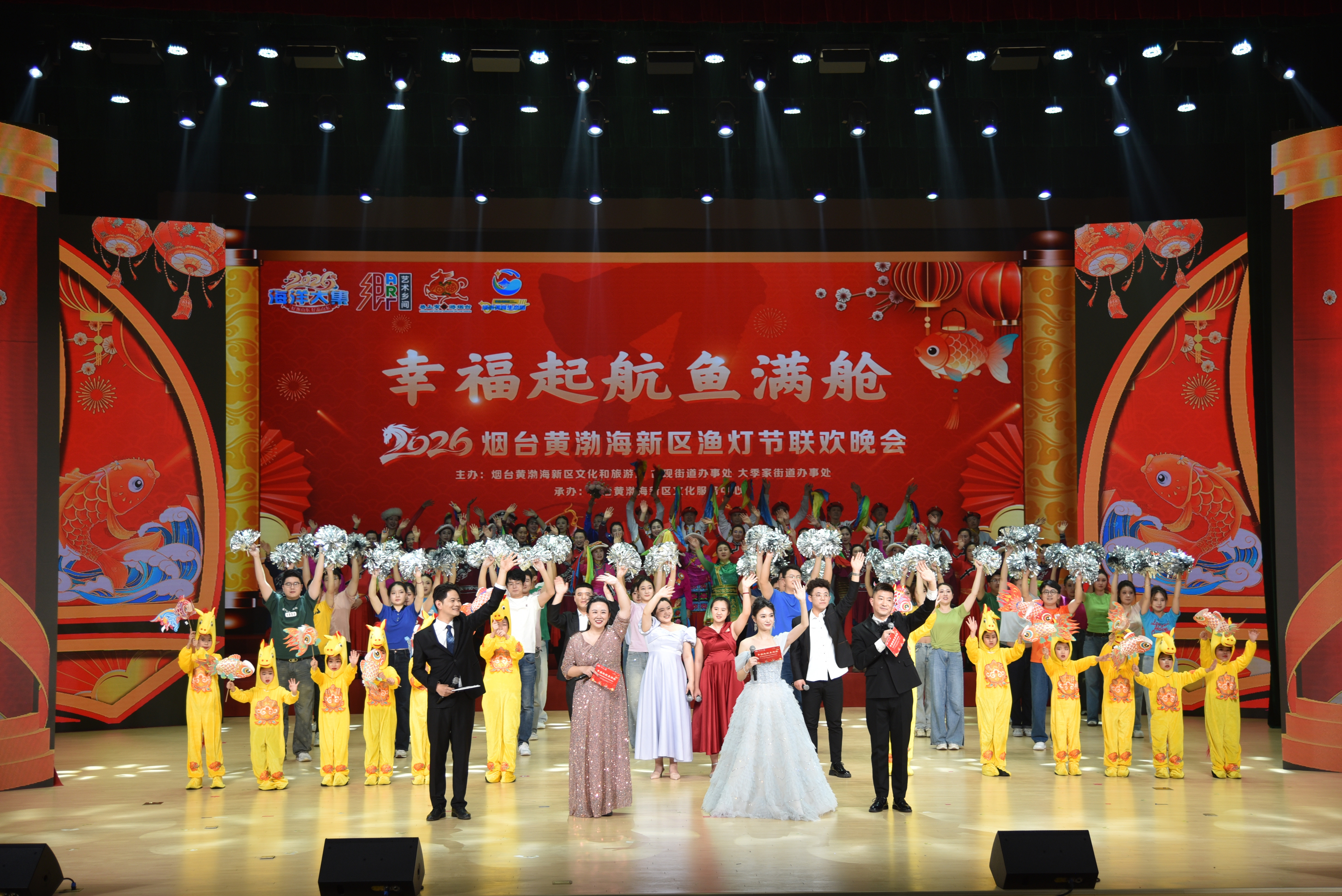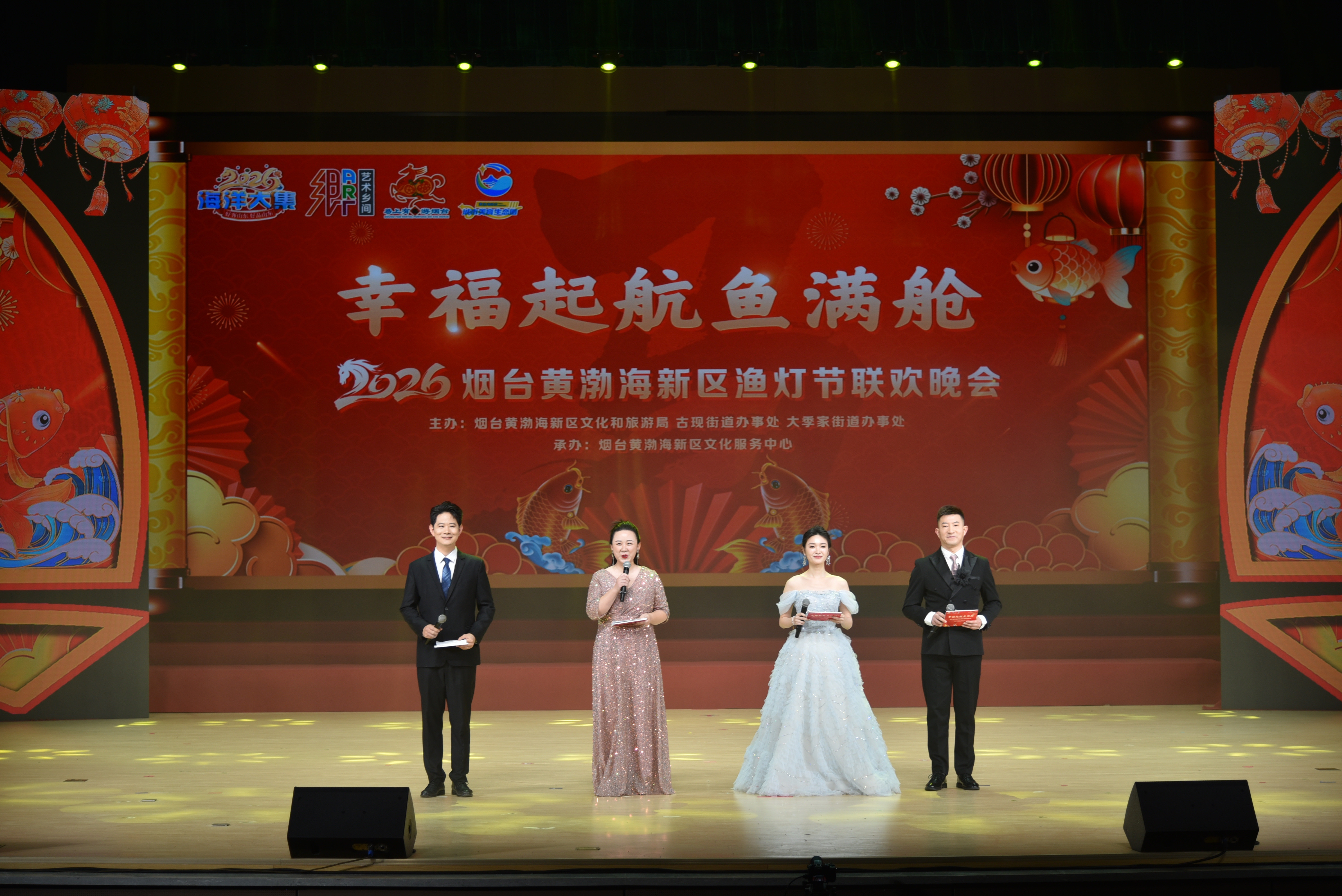胶东在线3月3日讯 (通讯员 于珊珊 蔺鹏飞 摄影 陈潘玉安)3月2日农历正月十四晚,由烟台黄渤海新区文化和旅游局、古现街道办事处、大季家街道办事处联合主办,烟台黄渤海新区文化服务中心承办的“幸福起航鱼满舱”2026烟台黄渤海新区渔灯节联欢晚会,在烟台卫生健康职业学院礼堂精彩上演。