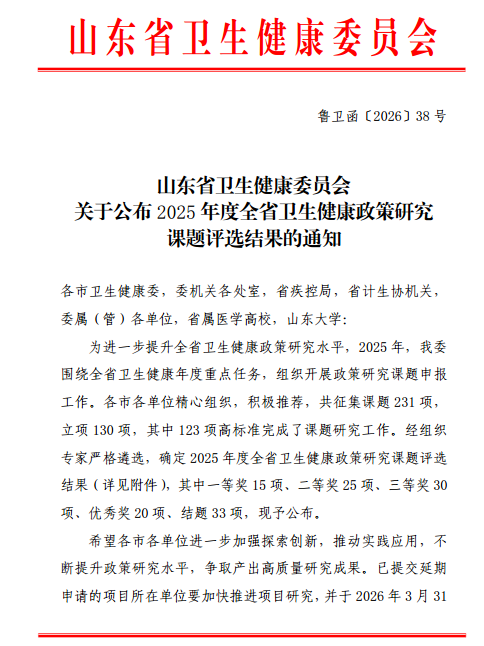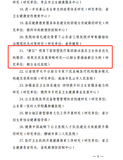 近日,山东省卫健委公布2025年度全省卫生健康政策研究课题评选结果,由烟台业达医院姜立新教授领衔的《“新区”视角下紧密型医疗集团驱动基层卫生体系优化的路径、效果及发展策略研究——以烟台黄渤海新区为例》荣获三等奖。