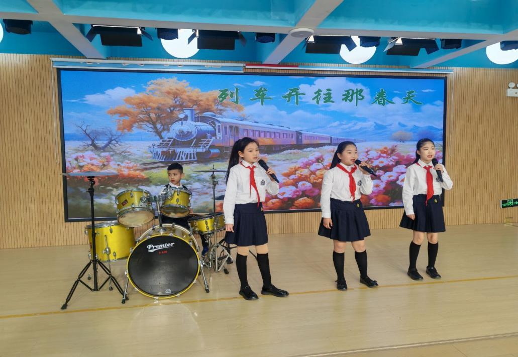 升旗仪式后,典礼围绕主题设置了精彩纷呈的学生展示环节:三年级学生融合诗词朗诵与歌曲表演《上春山》,用诗意迎接春天的希望;四年级学生献上活力四射的歌伴舞《乘风少年》,展现新时代少年“乘长风,破万浪”的蓬勃朝气;五年级学生则以一曲《列车开往那春天》,寓意新学期旅程满载梦想与期待。