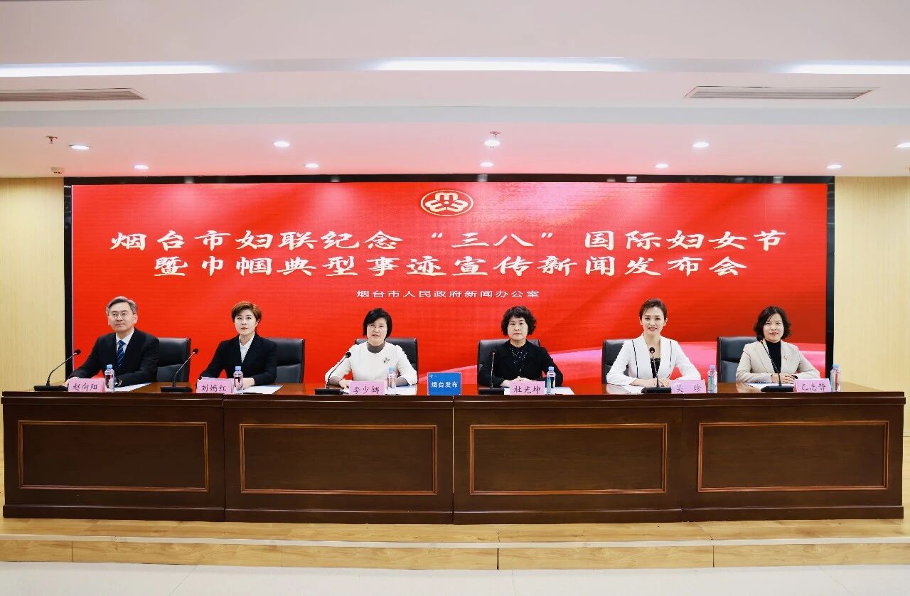 烟台市人民政府新闻办公室于3月6日(星期五)上午举行烟台市妇联纪念“三八”国际妇女节 暨巾帼典型事迹宣传新闻发布会。邀请烟台市妇联党组书记、主席李少娜;烟台市妇联党组成员、副主席,新闻发言人杜光坤;全国三八红旗手,海阳市鹤童村老年护理中心院长刘嫣红;全国三八红旗集体负责人,蓬莱阁景区管理服务中心导游科科长吴珍;全国巾帼文明岗负责人,万华化学集团股份有限公司生产质检中心总经理兼烟台质检中心经理乙志静介绍有关情况,发布会由中共烟台市委宣传部副部长赵向阳主持。