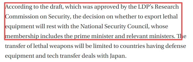 据日本媒体此前报道,根据自民党安全保障调查委员会批准的草案,是否出口致命性武器装备的决定权将归国家安全保障会议所有,其成员包括首相和相关阁僚。
