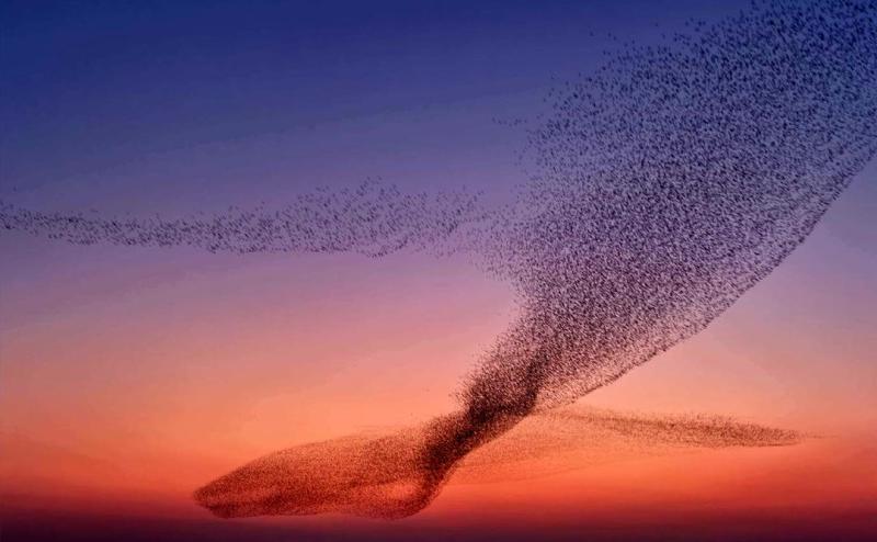 这群候鸟在空中随机变换着阵型:时而密集如云,遮蔽落日光芒;时而舒展如流云,随风飘动。有游客拍下的画面中,鸟群竟意外勾勒出巨鲸的轮廓,与《庄子·逍遥游》中“北冥有鱼,其名为鲲”的描写形成巧妙呼应。在场的游客纷纷举起手机记录,视频和照片刚一上传网络,迅速引发广泛关注。