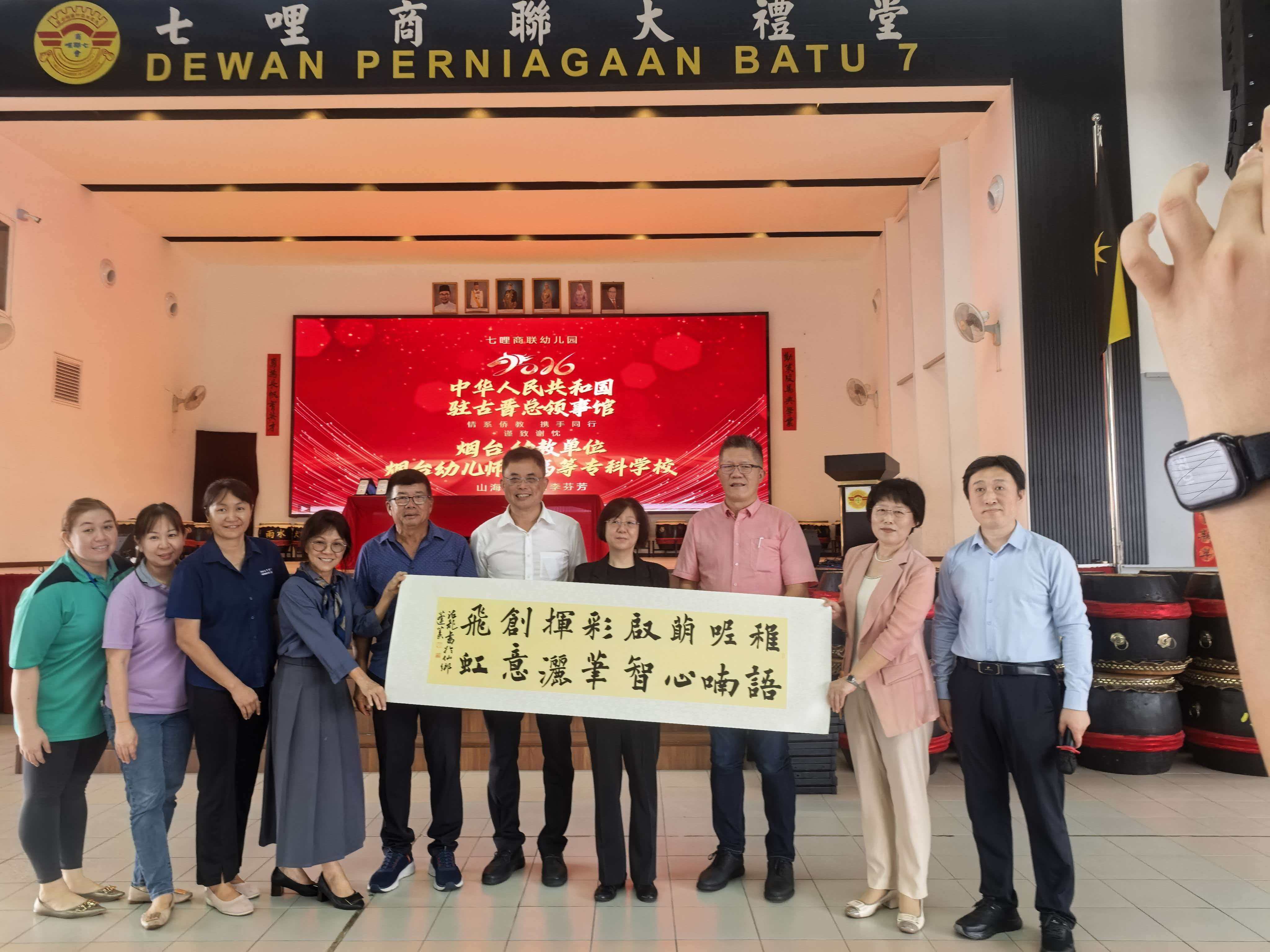 核心交流活动在古晋7哩商联幼儿园隆重举行,这场以幼儿教育为主题的交流盛宴,吸引了两地教育界、社团界及地方领袖的广泛参与。中国驻古晋总领馆副总领事宋长虹、领事詹浩宇、古晋巴达旺市议会主席陈开、烟台中华文化促进会会长徐骏、东马山东商会副会长姜龙、7哩商联会会长官裕恒、7哩商联会幼儿园主席本固鲁赖文麒、7哩商联会幼儿园园长廖玉樱和蔡宗璟等嘉宾出席。
