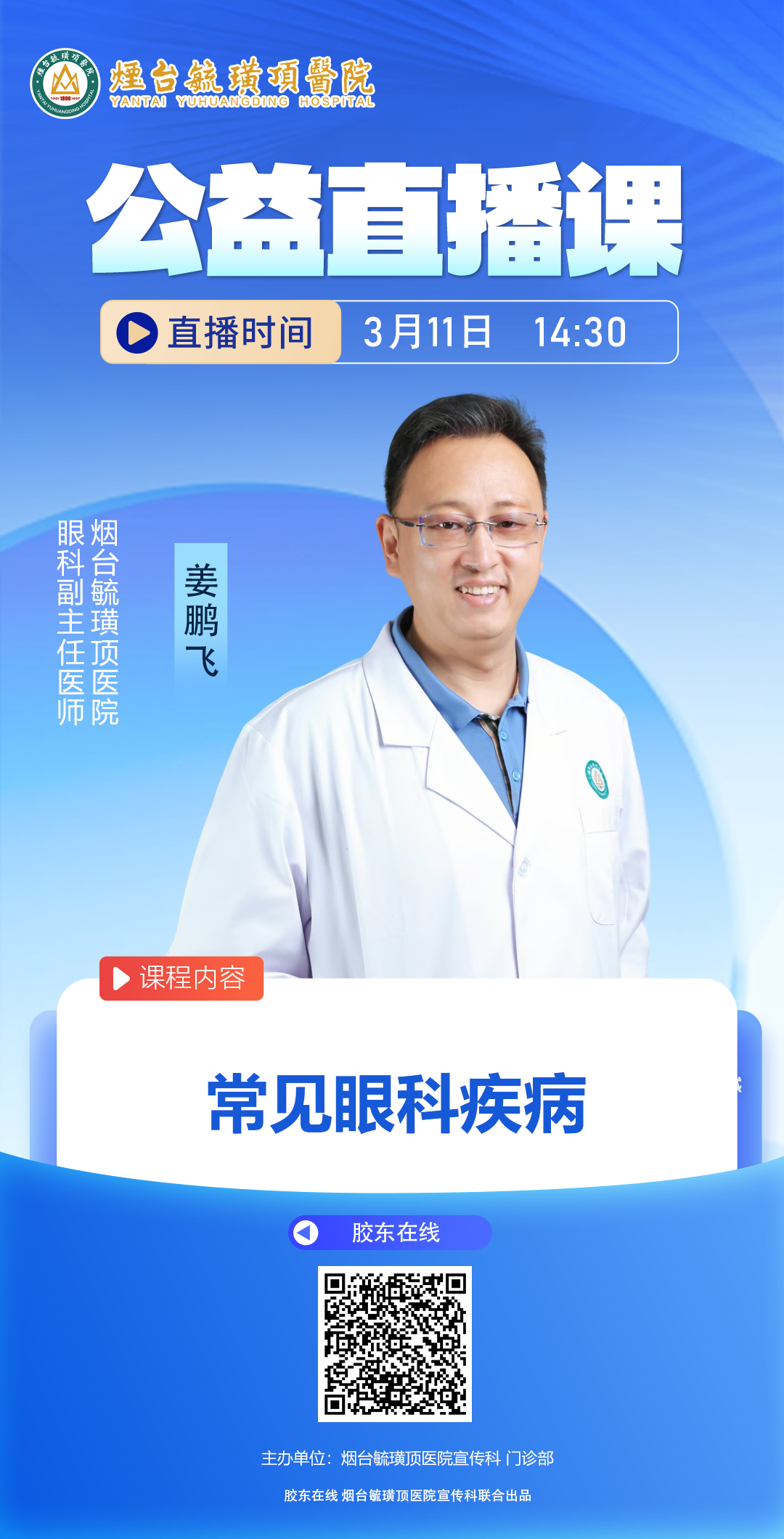 胶东在线3月16日讯(记者 栾雪 通讯员 李成修 王婧)眼睛是人体感知外界的重要器官,承载着视物、辨色、感知光影的关键功能,与日常生活、工作学习、身心健康息息相关。随着电子产品的广泛普及、用眼习惯的不断改变,以及人口老龄化进程加快,各类眼科疾病的发病率持续攀升,且发病群体愈发年轻化,不少市民因对眼病认知不足、忽视早期症状,导致病情加重,甚至造成不可逆的视力损伤。烟台毓璜顶医院门诊健康讲堂系列之三 ——“常见眼科疾病”邀请烟台毓璜顶医院眼科副主任医师姜鹏飞开展线上直播、答疑解惑,为广大市民送上专业、实用的护眼指南。