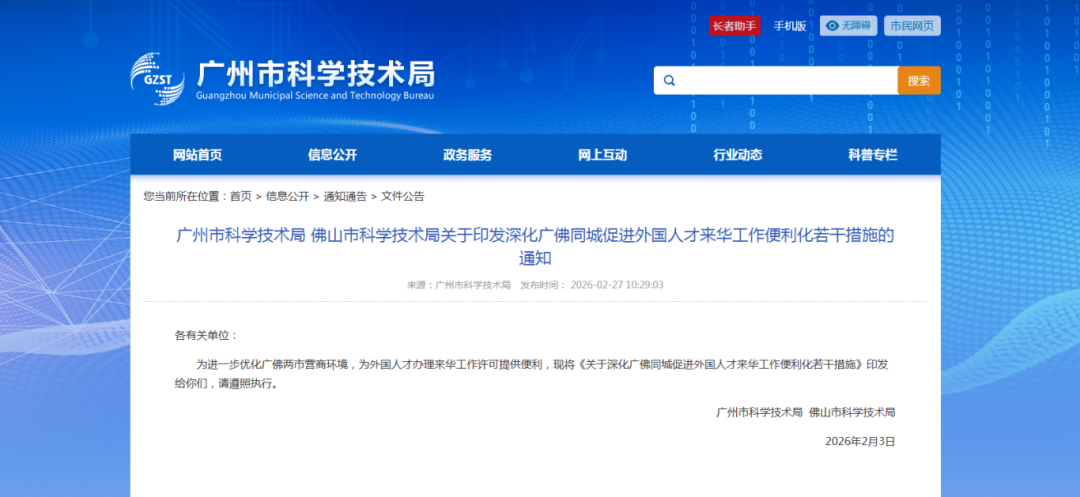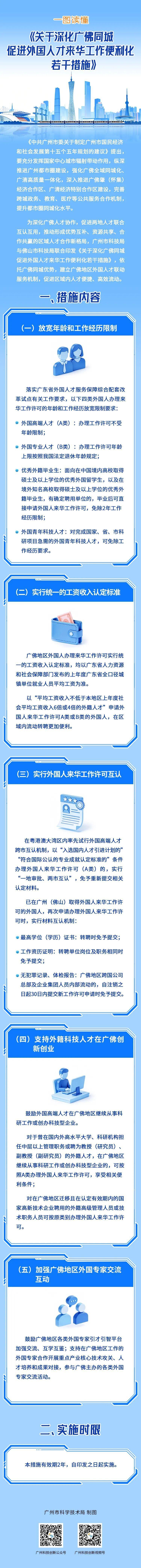 为深入贯彻落实广州市“十五五”规划关于深化广佛全域同城化的战略部署,推动湾区人才国际化流动,持续优化外国人才在粤创新创业环境,近日,广州市科技局与佛山市科技局联合印发《深化广佛同城促进外国人才来华工作便利化若干措施》(以下简称《措施》)。