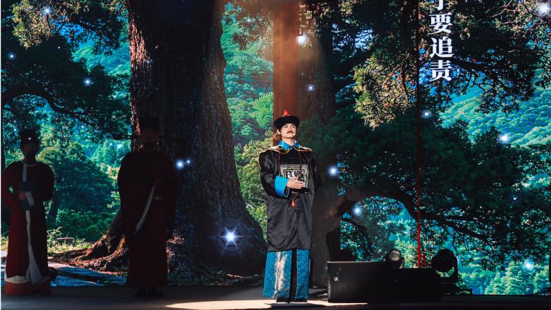 “三百年护柏成廊,非一日之功,乃官民共守律例之果。”舞台上,张鹏翮屏幕里的翠云廊背景说道,台下观众无不动容。