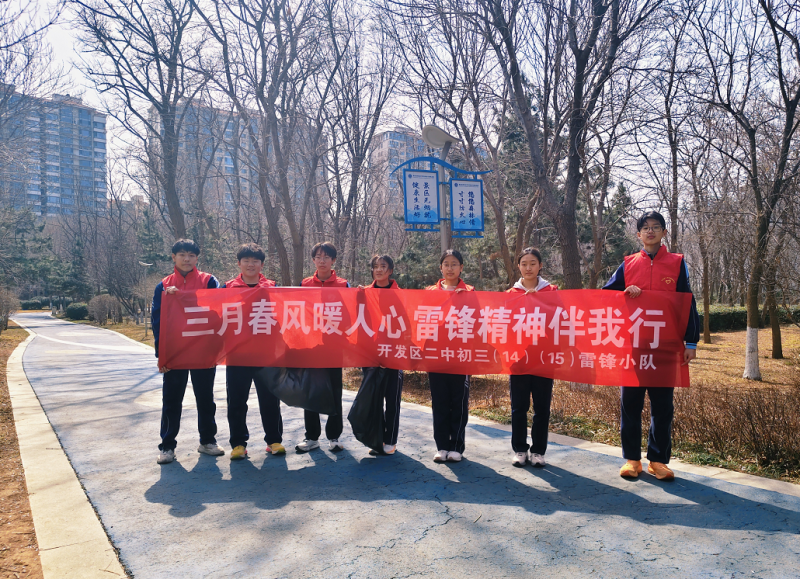 为传承和弘扬雷锋精神,烟台经济技术开发区第二初级中学初三(14)(15)班的同学们组建“雷锋小队”,于3月18日走进社区公园与街头,开展了一系列志愿服务活动,用实际行动书写新时代的雷锋故事。