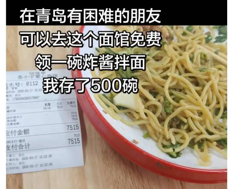 不仅如此,歌手吴克群被故事打动,专程赶赴青岛化身服务员,还定下温暖约定——3月10日至4月10日,面馆每卖一碗面,他便捐20元帮助聋哑儿童。全国各地的网友隔着屏幕开启“云点单”,外卖订单上,满是“不需要配送”“预存给有困难的人”的暖心留言,一句“我们陪你一起撑”,让跨越山海的善意汇聚在小小的面馆里。从企业到相关部门,从名人到普通网友,没有人是旁观者,每个人都是爱心的传递者,这份双向奔赴的善意,让青岛的春天格外温暖。