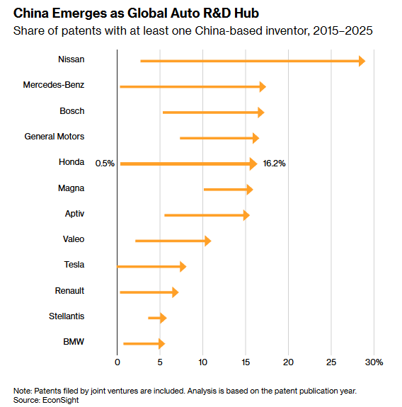 文章分析,中国在全球汽车研发中的参与度在持续提升,已成为重要的汽车研发中心。欧洲的汽车领军企业可能不得不在坚守日渐衰落的商业模式和与中国技术合作之间做出选择。
