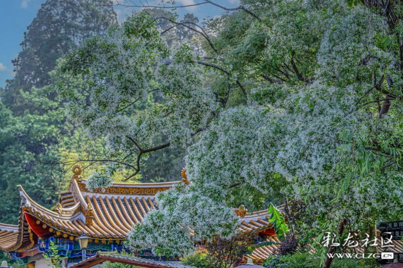 流苏花细长如丝,洁白胜雪,聚伞状花序密密匝匝地缀满枝头,远望如覆霜盖雪,近观似流苏垂落。微风拂过,花瓣如飞雪飘散,铺就一地洁白。这株古流苏树与黑龙潭的千年唐梅、宋柏、明茶并称“四绝”,每年花期仅10天左右,短暂而震撼,是昆明春日里最不容错过的“限时限定”美景。