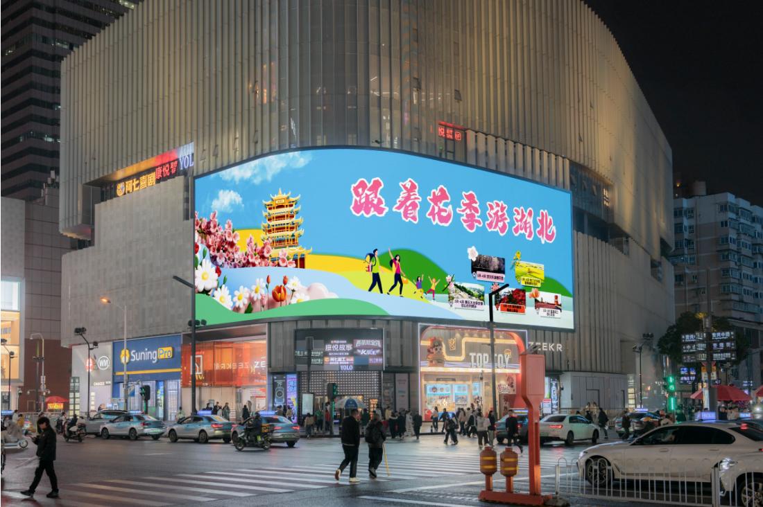 湖北文旅投放在长沙国金广场步行街的大屏,宣传语为“跟着花季游湖北”。 湖北省文旅厅供图
