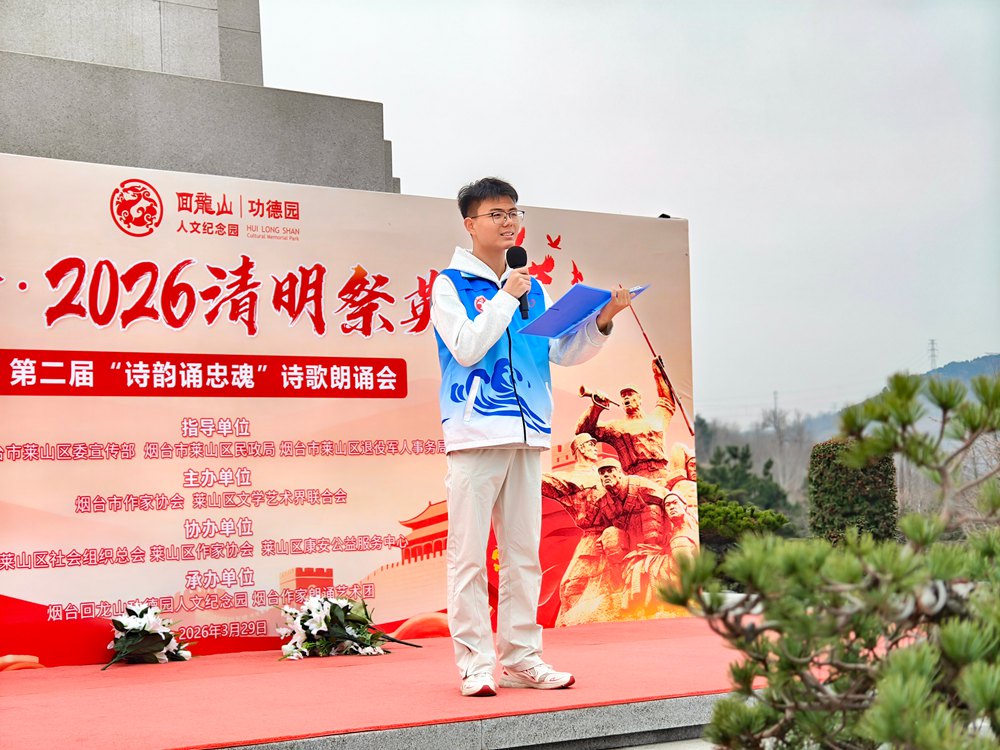 清明将至,哀思满怀。为缅怀革命先烈、传承红色基因,3月29日上午,由烟台市莱山区委宣传部、区民政局、区退役军人事务局指导,烟台市作家协会、莱山区文学艺术界联合会主办,莱山区社会组织总会、莱山区作家协会承办,烟台回龙山功德园人文纪念园、烟台作家朗诵艺术团承办的“追寻·2026清明祭英烈”暨第二届“诗韵诵忠魂”诗歌朗诵会,在烟台胶东子弟兵纪念广场隆重举行。山东工商学院、山东商务职业学院、烟台职业学院的青年学子代表,与各界嘉宾、文学爱好者齐聚一堂,以诗为媒,向英烈致以最崇高的敬意。