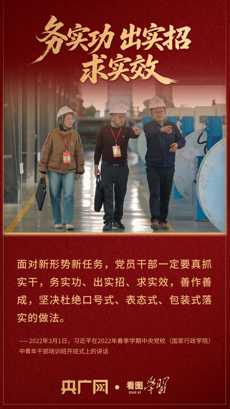 “一件一件抓落实,一年接着一年干,努力让群众看到变化、得到实惠”。习近平总书记深刻指出,面对新形势新任务,党员干部一定要真抓实干,务实功、出实招、求实效,善作善成,坚决杜绝口号式、表态式、包装式落实的做法。