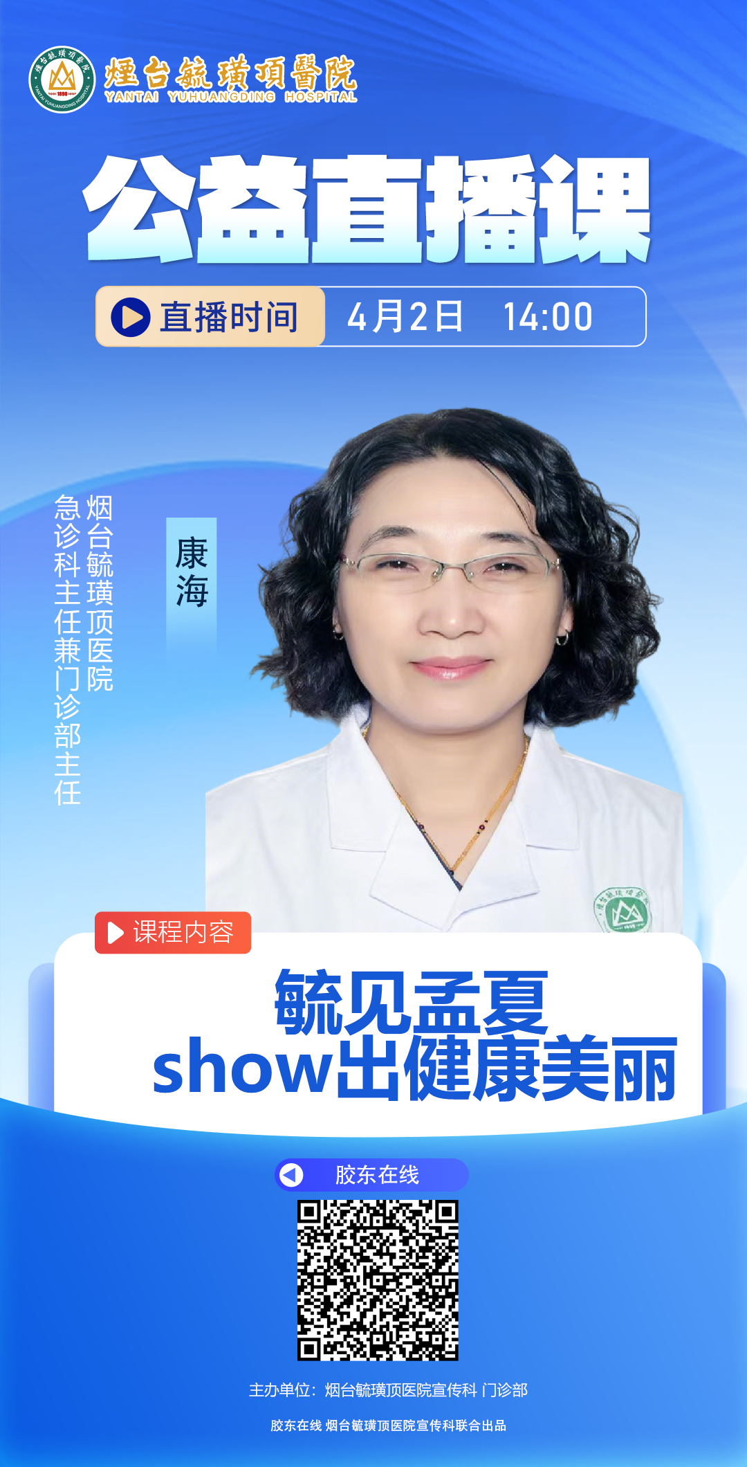 烟台毓璜顶医院门诊健康讲堂系列之七——“毓见孟夏,show出健康美丽”即将开讲!你将在直播中了解到烟台毓璜顶医院总院本部与莱山院区健康体重管理相关门诊的详细布局,包括营养减肥门诊、儿童体重管理门诊、孕期营养与体重管理门诊、中医减重门诊等特色专科的诊疗范围,以及 MDT 多学科会诊门诊如何为复杂肥胖病例提供一站式诊疗服务,解锁全周期、多方位的体重管理体系。