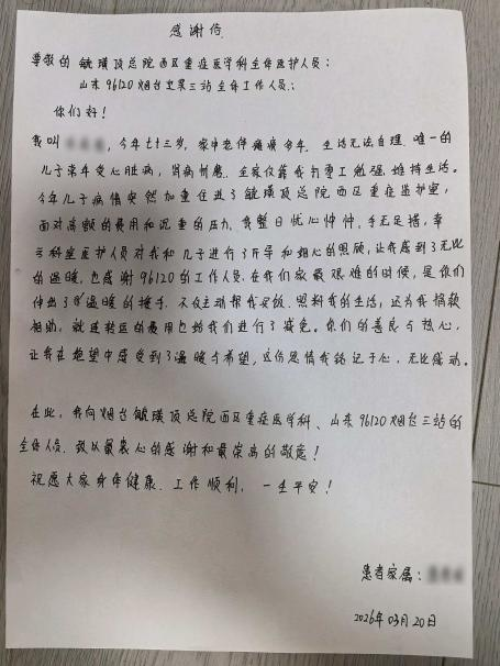 近日,山东96120医疗照护转运中心烟台芝罘三站与烟台毓璜顶医院西区重症医学科,共同收到一封73岁烟台老人亲手书写的感谢信。质朴的字迹间,饱含着老人对96120工作人员与医护人员倾力帮扶、全程守护的深深谢意。
