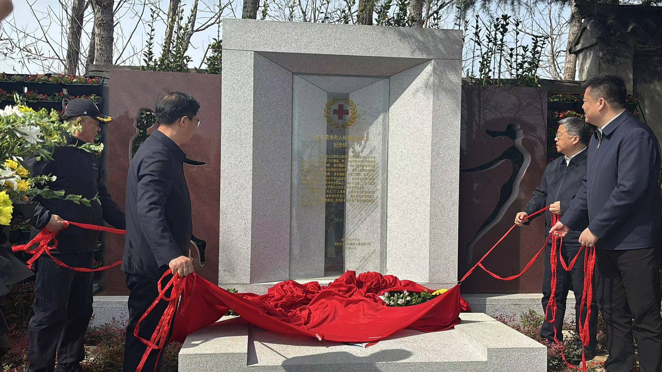 烟台市遗体和人体器官捐献缅怀纪念园坐落在回龙山功德园公墓,园内竖立一座门型纪念碑寓意“生命之门”,彰显捐赠者们大爱无疆的奉献精神。中国红十字会总会党组成员、副会长兼秘书长李立东,省红十字会党组书记、常务副会长白同禹,市政府副市长、市红十字会会长林钰涛,烟台回龙山功德园公墓有限公司总经理刘乃军共同为遗体器官捐献纪念碑揭幕。