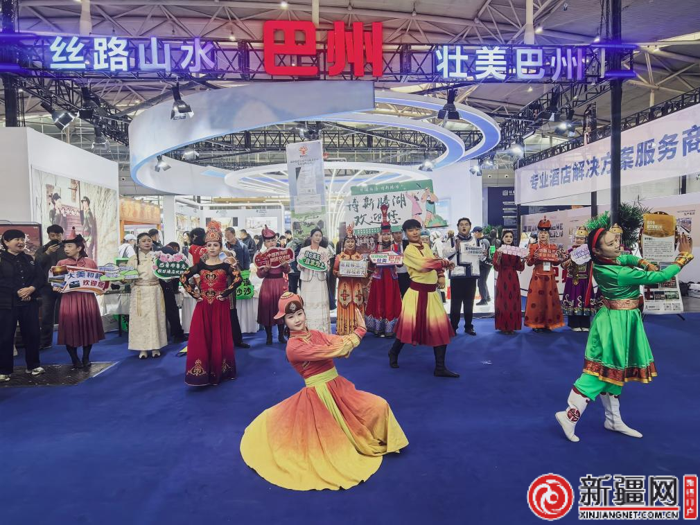 巴州展馆前欢歌热舞,精彩的文旅推介受关注。(薛玲摄)