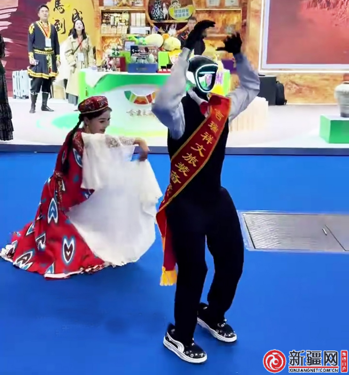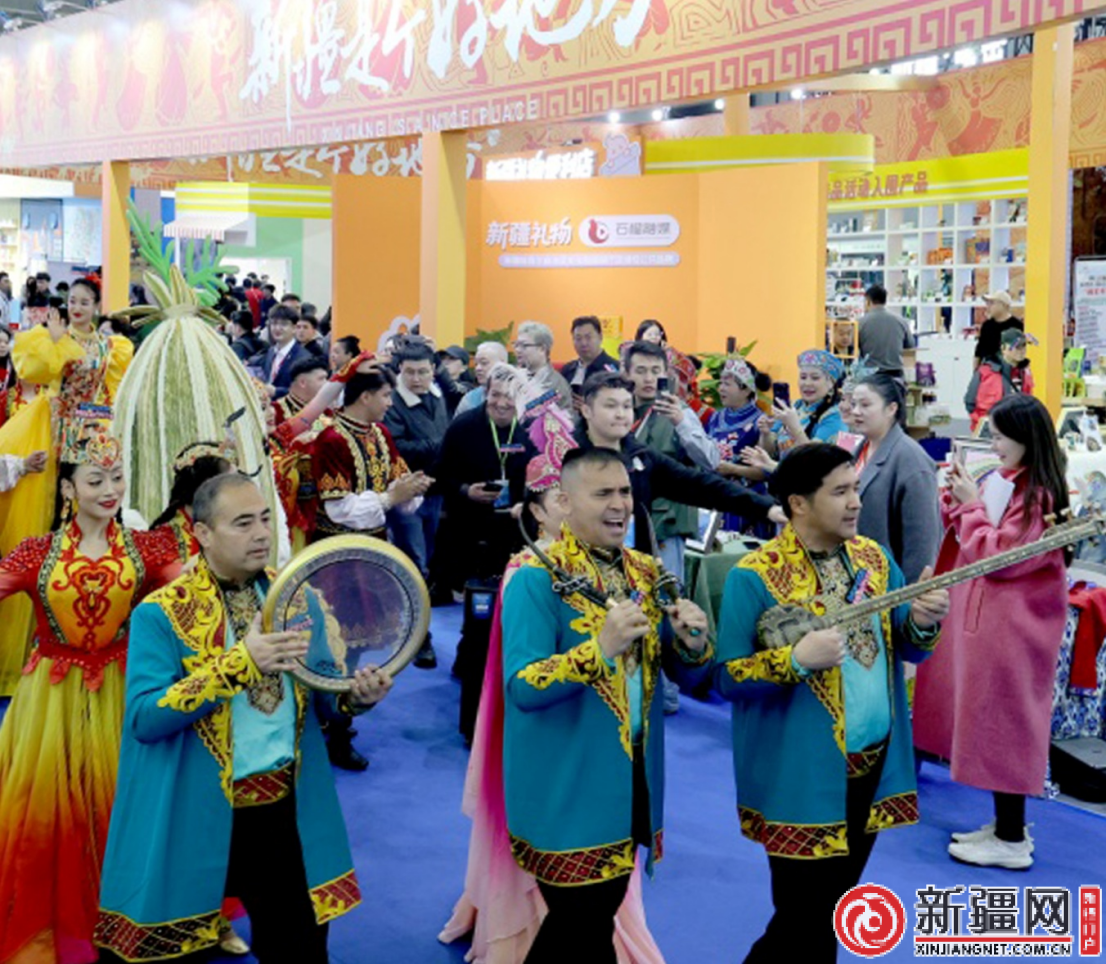 本届春博会得到山东泰安援疆指挥部援建的岳普湖县达瓦昆景区总冠名支持。图为岳普湖达瓦昆团队在展馆内巡演现场,气氛热烈。(李卫疆摄)