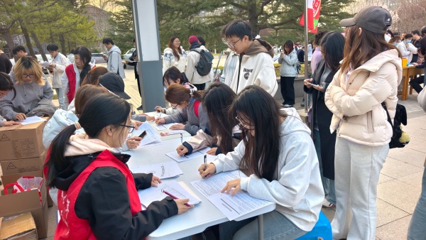 现场,学生志愿者代表还宣读了青年献血倡议书,号召更多同学加入到无偿献血队伍中来,用热血传递爱心,贡献青春力量。随后,山东医药大学学生志愿者面向签名墙签名,同时部分学生现场登记进行无偿献血、造血干细胞血样采集。不一会,学校南广场上,两辆献血车前就排起了长队。队伍中有不少新生面孔,记者了解到大一口腔学技术(听障)班虽然是第一次参与无偿献血活动,却几乎是全班出动,甚至有的男生寝室全寝室都前来参与无偿献血。“这已经是筛过一波的人了,班上还有好多女生也想参与,但身体指标不达标,让我‘劝退’了。”班长李博文说。