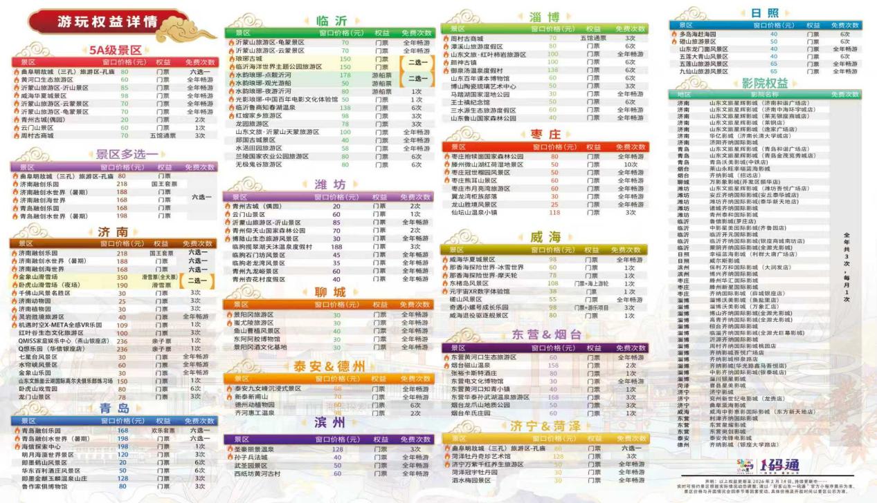 “好客山东一码通”是由山东省文化和旅游厅、山东省人力资源和社会保障厅、山东省大数据局共同指导,山东文旅集团文旅云公司建设、运营和发行的山东省旅游年卡。该旅游年卡整合全省16市170余家优质文旅资源,其中涵盖5A景区9家、4A景区约50家,同时包含数十次温泉体验、3次免费观影权益,以及滑雪、高尔夫、摩天轮、海上游轮、儿童娱乐中心、亲子乐园等多元化本地生活类资源,综合权益价值约21000元。