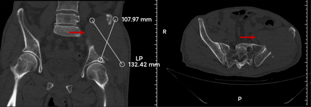 患者李先生(化名)因左侧髋骨剧烈疼痛入院。据其自述,疼痛剧烈致无法平卧及行走,甚至咳嗽时亦引发剧痛,日常生活受到严重影响。经骨病与骨肿瘤科苏情医生团队详细问诊及查体发现,患者两年前曾确诊右侧肾癌但未接受治疗。一周前突发左侧髋部剧痛,影像学检查提示左侧髂骨存在明显骨质破坏,并见一巨大软组织肿块突入盆腔。入院后患者呈严重贫血状态,凝血机制明显异常。穿刺活检病理结果证实,该肿瘤为肾癌骨盆转移。