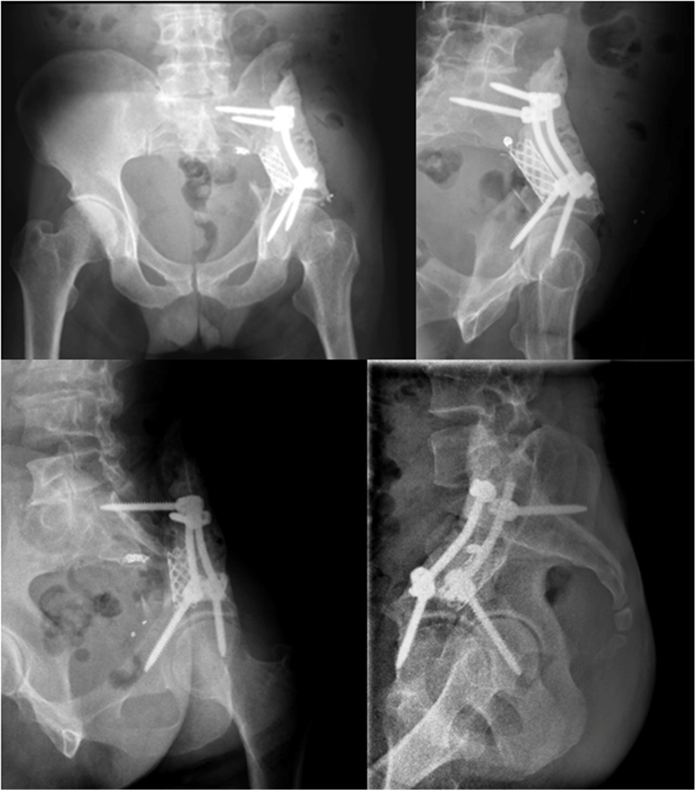 术中,手术团队在完整剥离巨大肿瘤的同时,精细保护并松解受压的血管与神经组织。肿瘤完整切除后,针对髋臼顶部骨缺损区,团队于髋臼前后侧、骶骨及残留髂骨处精准植入椎弓根螺钉,截取合适长度钛网进行填充,并以钛棒连接螺钉加压固定,最后利用骨水泥重塑髂骨外形,构建成坚固的“钢筋水泥”结构。整台手术历时约4小时,过程顺利,出血量仅600毫升。